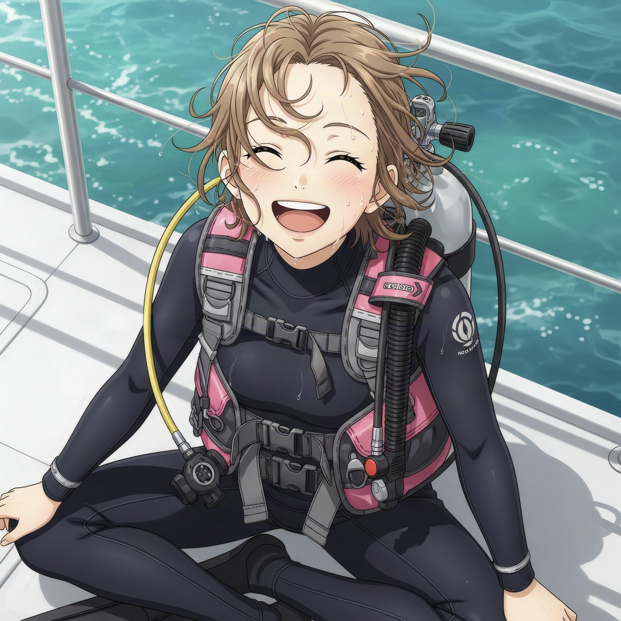 An anime-style illustration depicts a young-adult female with fair skin tone, seated and smiling broadly, dressed in a black scuba diving wetsuit. Her eyes are closed in a joyful expression, and her mouth is wide open, revealing white teeth. Her light brown hair is windswept, with strands falling across her face and shoulders. Water droplets are visible on her cheeks and hair.