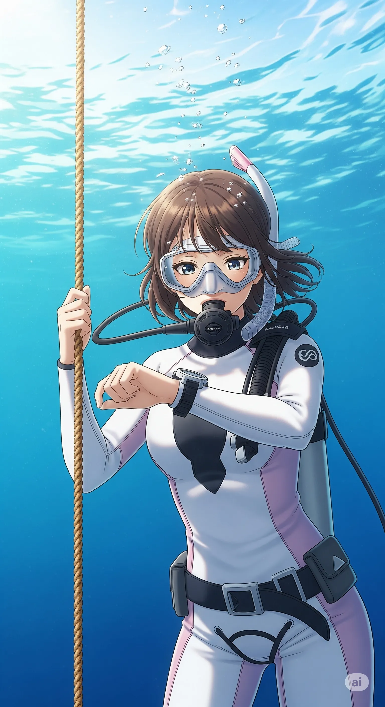 An anime-style illustration, rendered in soft hues, shows a young adult woman with light skin tone and brown hair, laughing joyfully as she sprays water from a hose. She is wearing only a white and light pink wetsuit, having finished diving and now cleaning her equipment. Her brown hair is parted on her left side and styled in a short bob. Her wetsuit is predominantly white with light pink accents on the sides of her torso and arms. A white symbol resembling a stylized "S" is on her right bicep. The water from the hose creates splashes and a sense of movement around her.