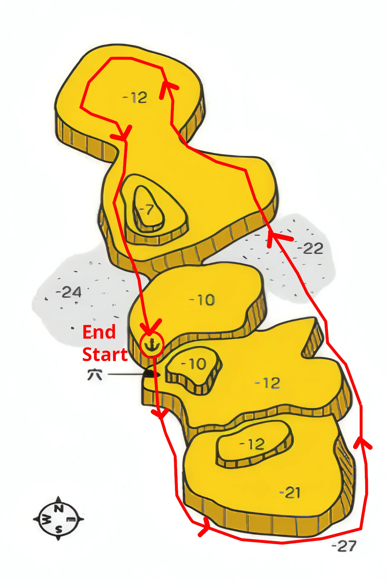 図に移動ルートを示す赤線を便宜的に引っ張っていますが、それぞれのダイビングでこの通りのコース取りが採られるわけではありません。日によっても違いますし、何を見たいのかとかによってもコース取りは変わります。アンカーからほとんど離れずに、ひたすら根の岩で暮らしている小さな魚をひたすら見てる、というようなダイビングもあります。