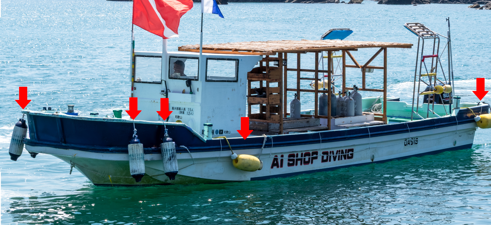 一方ボートがダイビングポイントに着いてアンカリングを済ませた後はフェンダーは原則的に外に下ろします。ダイビングの準備やエキジット後のバタバタ時に邪魔だからです。ときには踏んづけて転ぶ人もいて、ボートから転落して落水するリスクもあり、やはり危険だからです。ボートの上は狭いのです。
