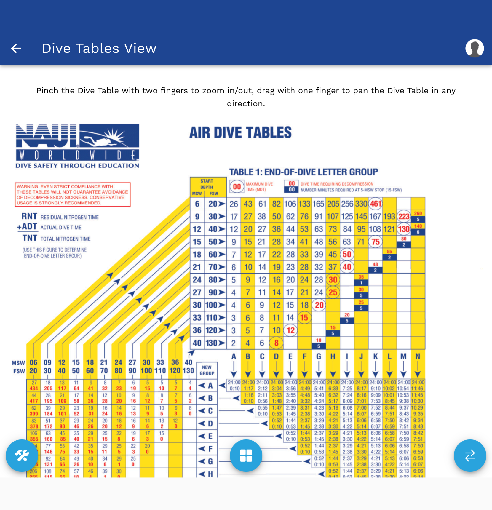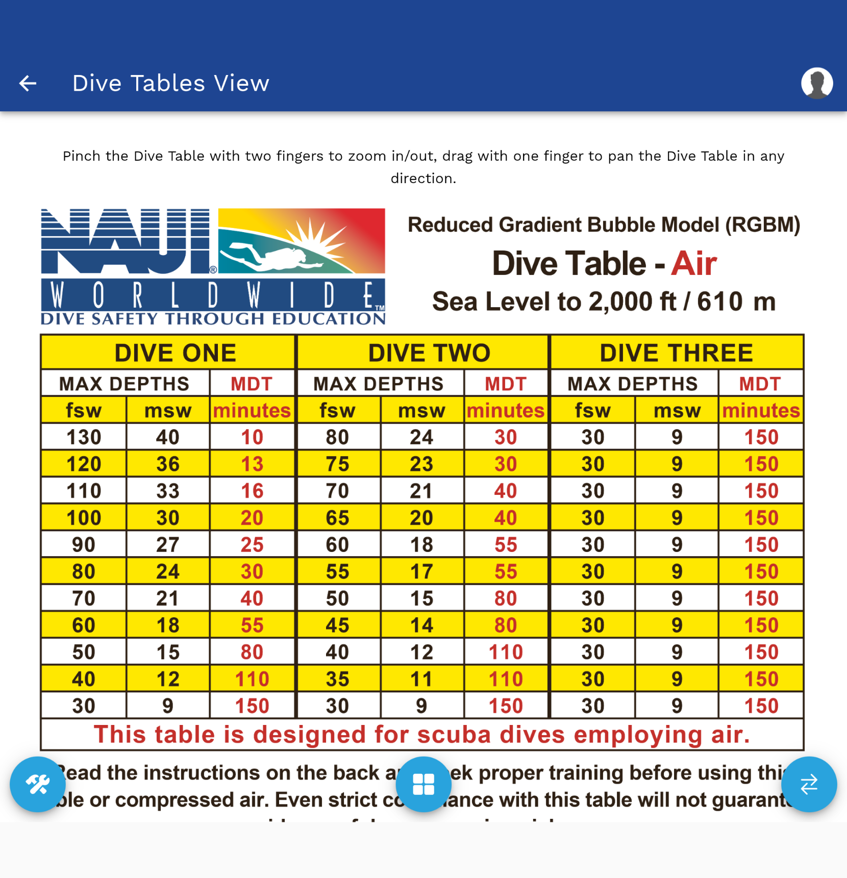 NAUI のダイブテーブルになりますが、最新のものが Android アプリで見れます。ダイブテーブルを見るだけなら無料です。iPhone 版があるかどうかは、調べてください。