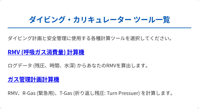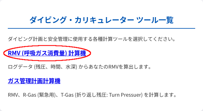 このダイビング・カリキュレーターには、日々の RMV の計算を助けるための "RMV (呼吸ガス消費量) 計算機" が含まれています。使ってください。