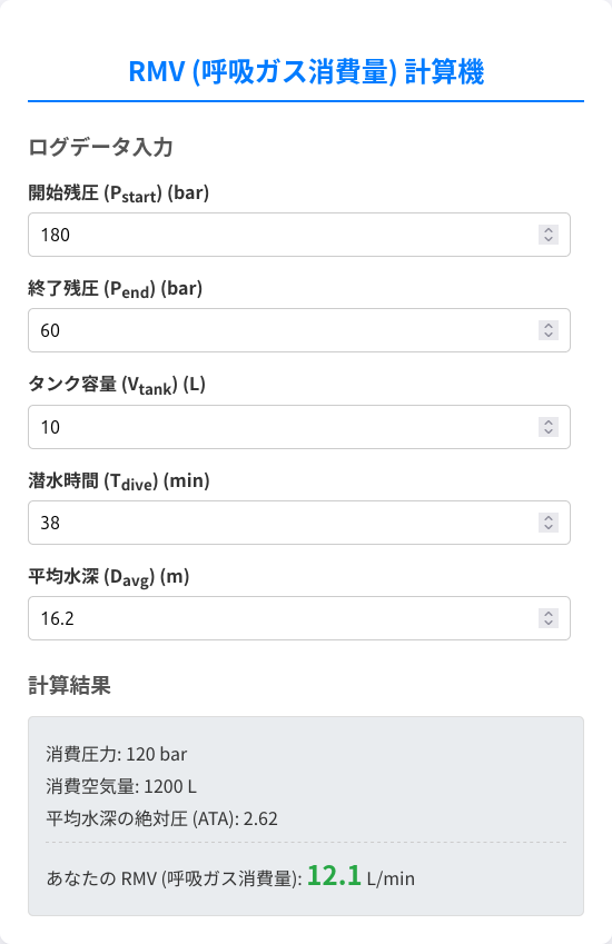 RMV(水面分時呼吸量)は、ダイバーのガス消費率をリットル毎分()で示したもので、以下の計算式で求められます。