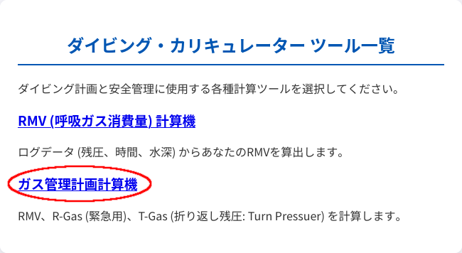 ダイビング・カリキュレーターの初期画面で、赤丸で囲った "ガス管理計算機"をクリック、またはタップします。