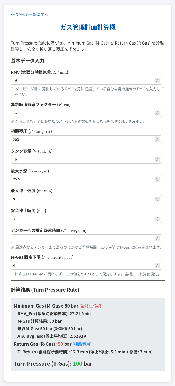 このツールは、あなたの を使って と を計算し、最終的な を自動算出します。そして、NDL の時間制限と の時間制限を比較し、より短い方を採用する、というイマドキの潜水計画の決定をサポートします。