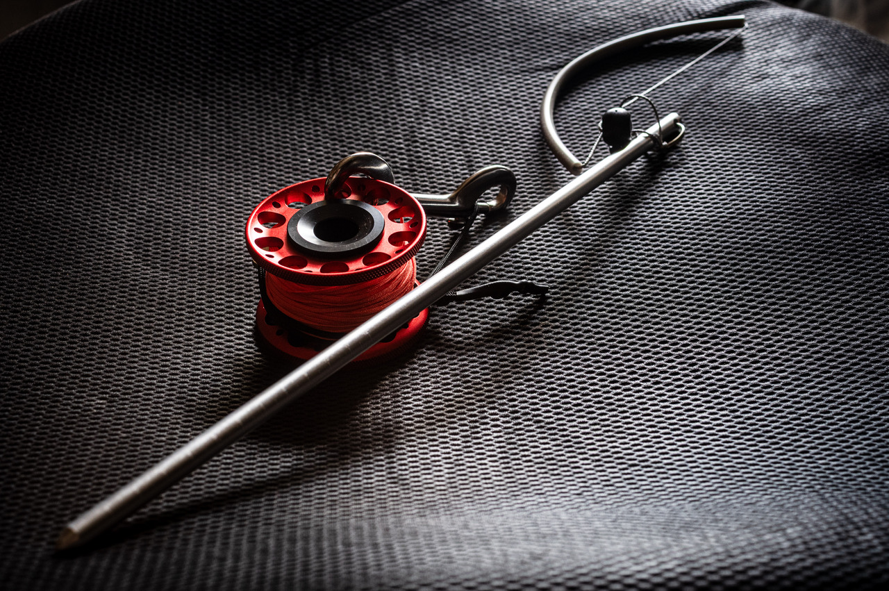 リールは他にもアドバンスコースでのサーチアンドリカバリーの補助ロープとして使ったりします。距離の目印を入れてスキンダイビングの水平潜水のルートを示す目印にしたりと、こちらも汎用性が高いです。