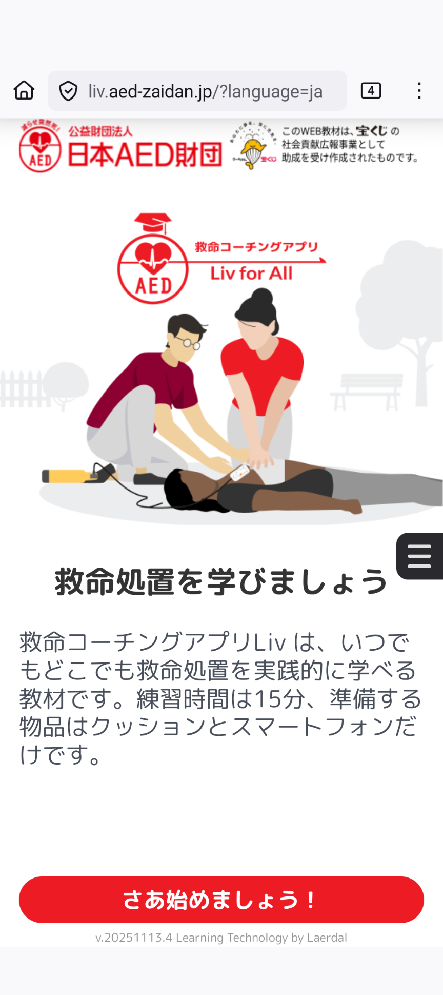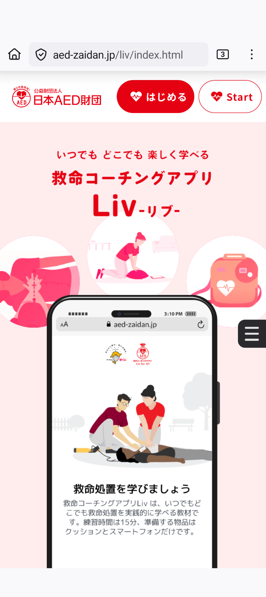 救命コーチングアプリ Liv とは AED を使った CPR の学習を支援する Web アプリケーションです。公益財団法人日本AED財団が無料で公開しています。Web アプリケーションですからほぼ全てのスマートフォンで使うことができます。無料で使うことができます。アカウントを作る必要もありません。