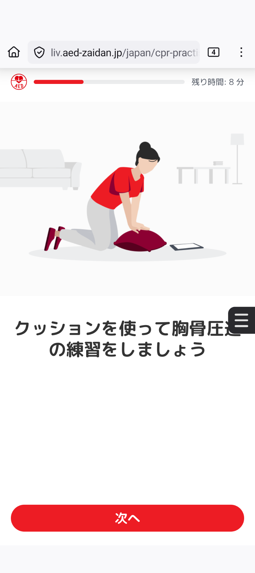"さあ始めましょう!" ボタンをタップしてください。しばらくはバイスタンダーによる CPR の意義や、動画を含む様々なコンテンツが続きます。ときどき学んだ知識の確認クイズもあります。