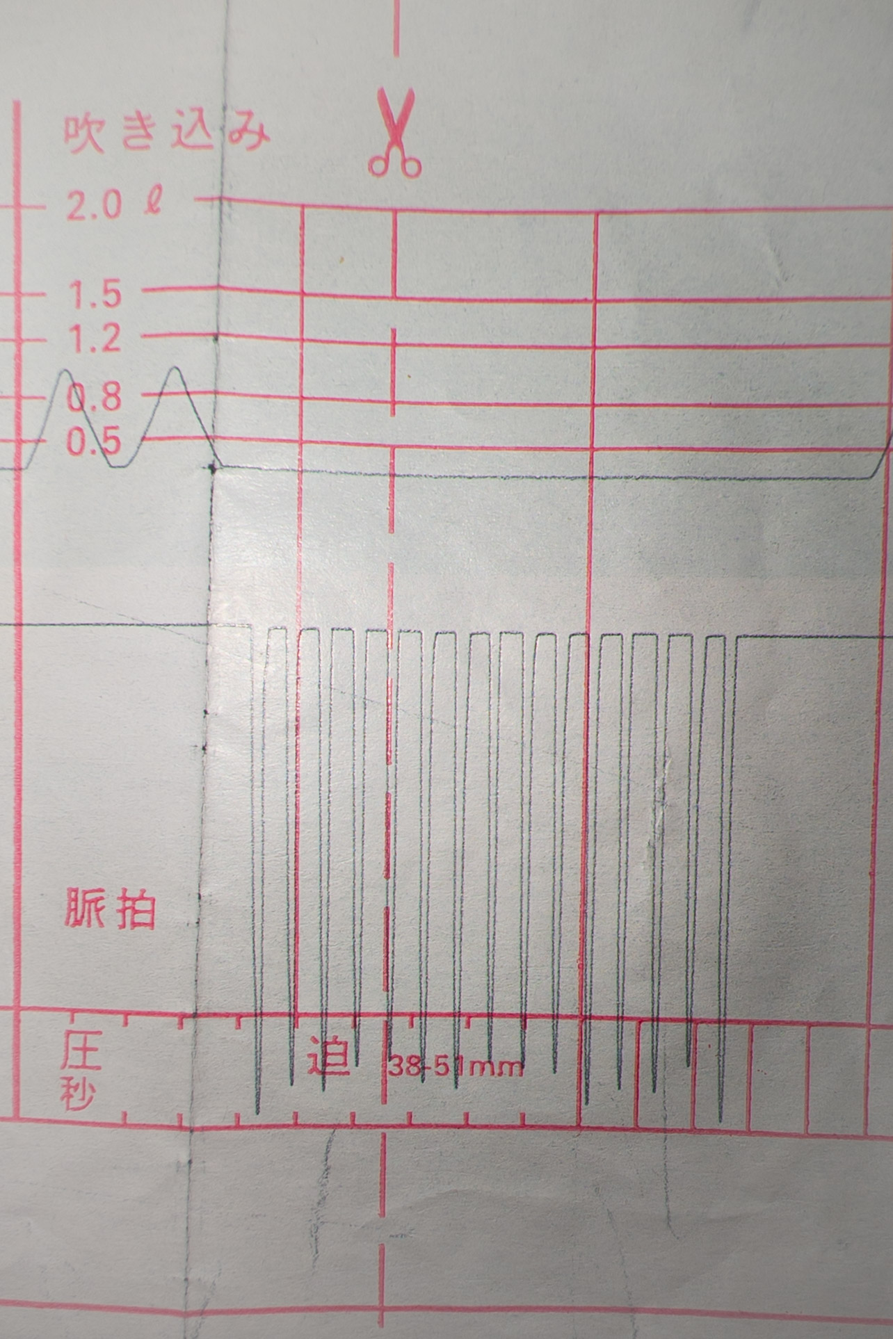 画像は古いぼくの CPR トレーニングのログで、データは昔のプロトコルに従ったものです。なので、最近になって CPR を学んだ人たちにとっては不思議な波形をしています。