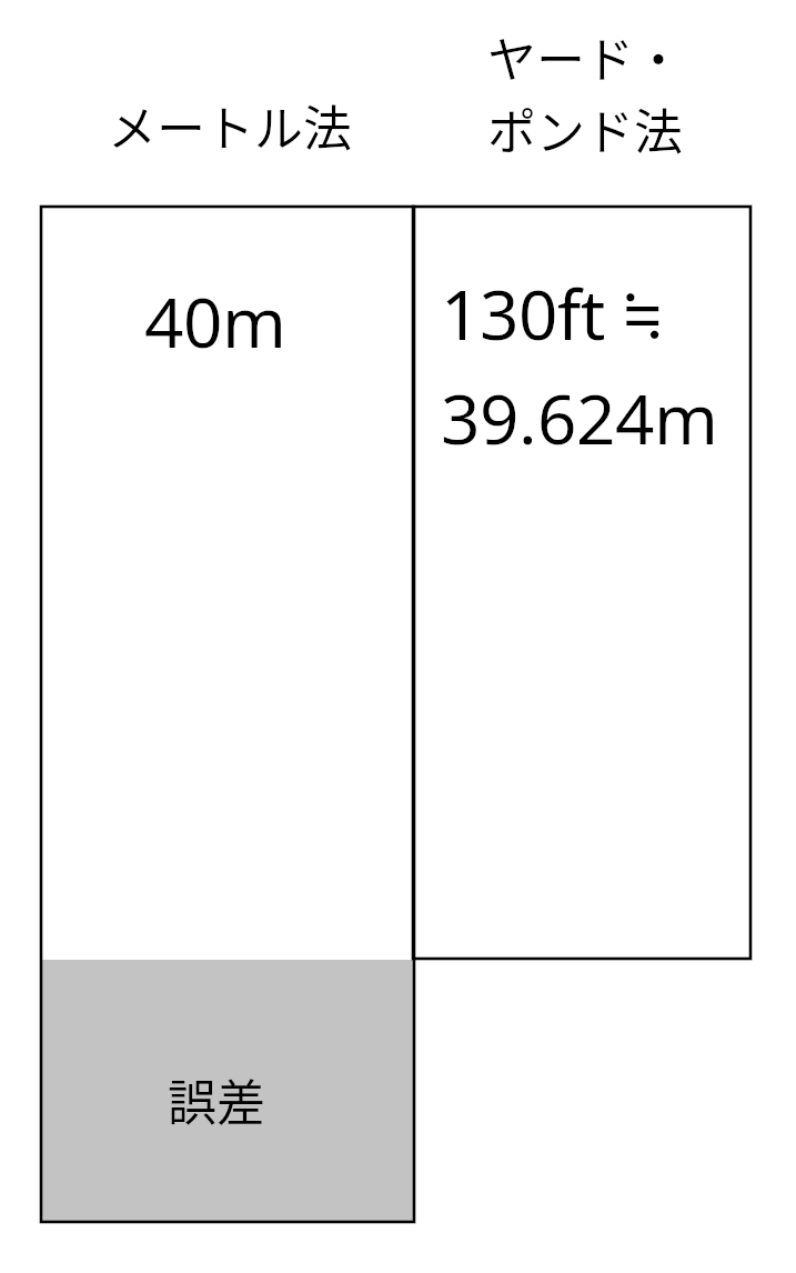 | メートル法 (m) | ヤード・ポンド法 (ft) | 単純変換値 (m) |